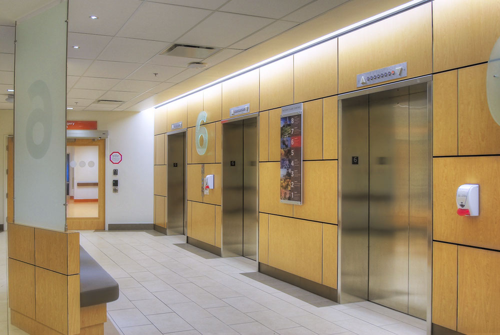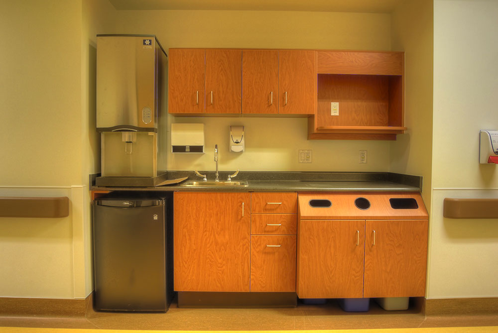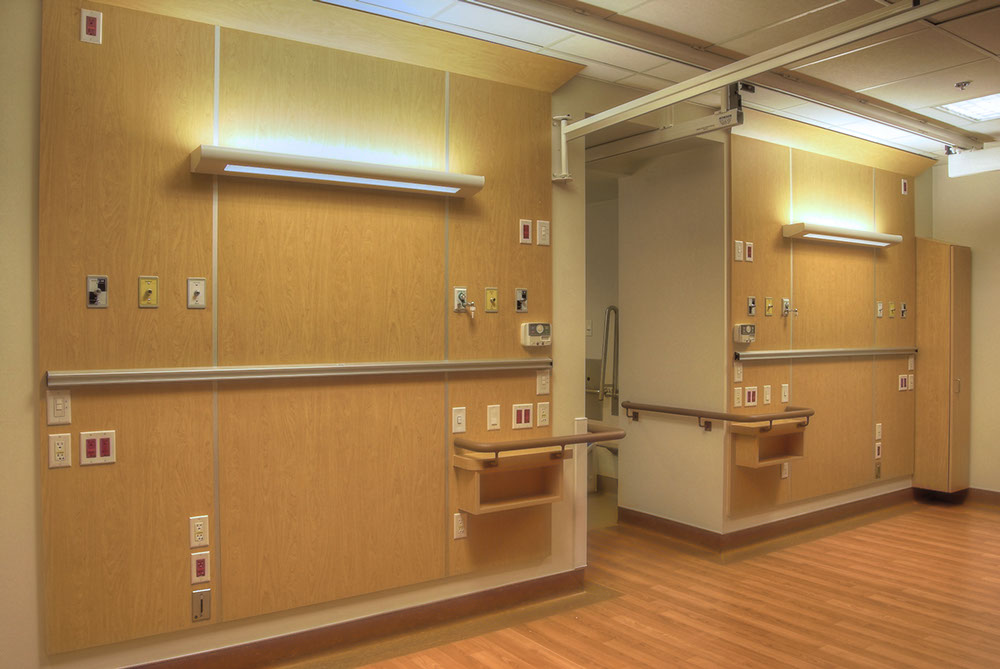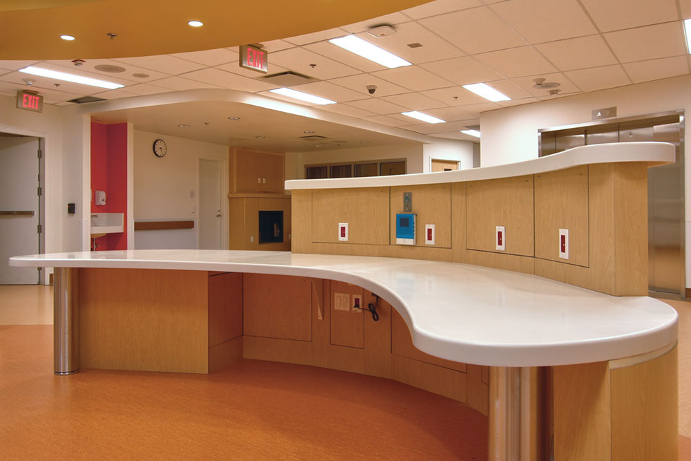 This LEED Gold, P3 project involved the manufacture and installation of millwork to over 275 patient rooms, dozens of nurses stations, wall paneling and much more. Solid surface was used extensively, on vanities with integral sinks, window sills and nurse station work surfaces.
