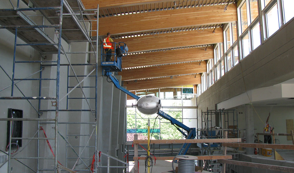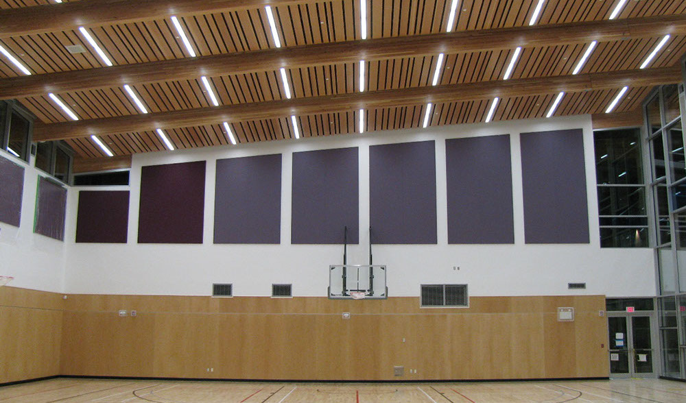 This stunning project involved the manufacture and installation of over 9000 sq. feet of acoustically dampened, fire rated Douglas Fir ceiling panels at heights of up to 65 feet.